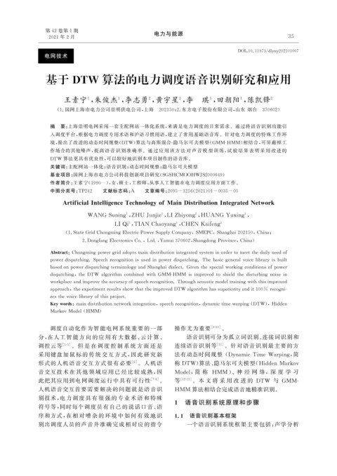 关键词: 主配网站一体化; 语音识别; 动态时间规整; 隐马尔可夫模型