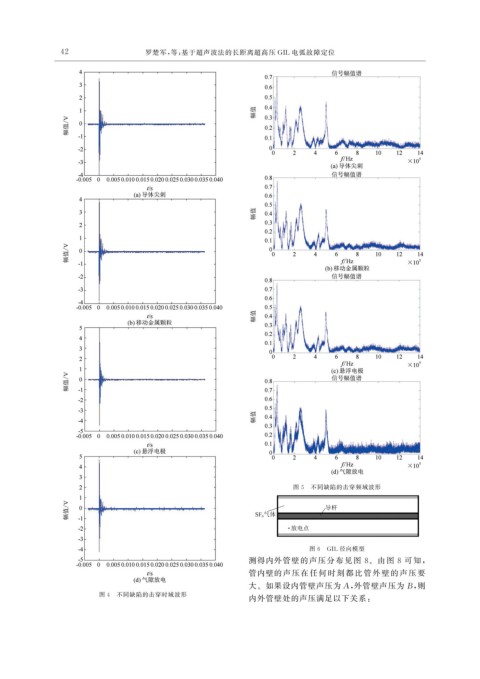 4 2 罗楚军, 等: 基于超声波法的长距离超高压 GIL 电弧故障定位 图 5 不同缺陷的击穿频域波形 图 6 GIL 径向模型 测得内外管壁的声压分布见图 8 。由图 8 可知, 管内壁的声压在 任何时刻都比管外壁的声压要 大。如果设内管壁声压为 A , 外管壁声压为 B , 则 图 4 不同缺陷的击穿时域波形 内外管壁处的声压满足以下关系:
