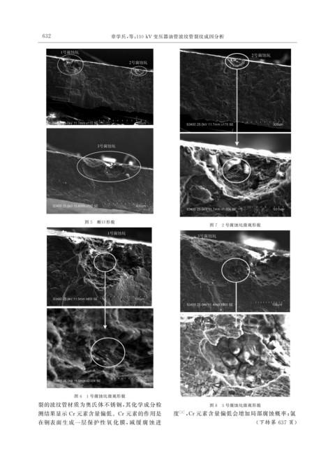 6 3 2 章学兵, 等: 110kV 变压器油管波纹管裂纹成因分析 图 5 断口形貌 图 7 2 号腐蚀坑微观形貌 图 6 1 号腐蚀坑微观形貌 裂的波纹管材质为奥氏体不锈钢, 其化学成分检 图 8 3 号腐蚀坑微观形貌 测结果显示 Cr元素含量偏低。 Cr元素的作用是 度 [ 3 ] , Cr元素含量偏低会增加局部腐蚀概率; 氯 在钢表面生成一层保护 性 氧 化 膜, 减 缓 腐 蚀 进 ( 下转第 637 页)