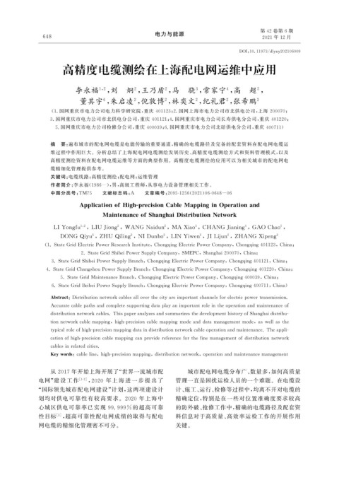 关键词: 电缆线路; 高精度测绘; 配电网; 运维管理