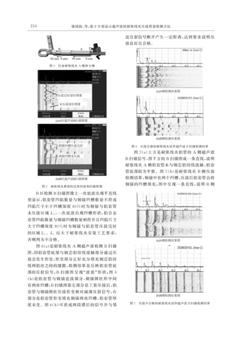 度未变。图 6 ( b ) 可看成两段滞后的信号并与邻 图 7 压接不合格的耐张线夹试件超声波 B 扫描检测结果