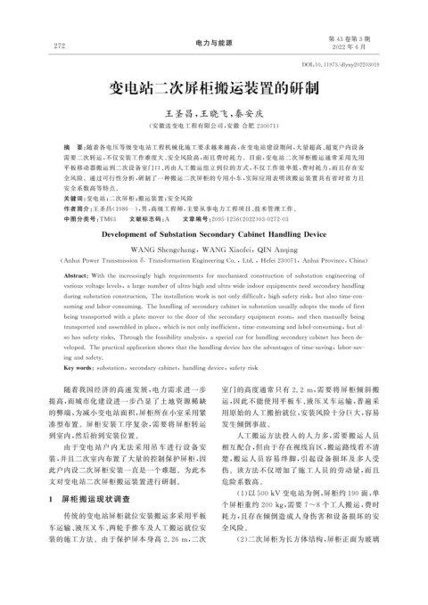 文对变电站二次屏柜搬运装置进行研制。 危险系数高。
