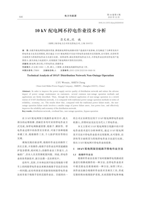 停电作业方法及应用情况,然后通过 10 kV 配电网某开关站不停电作业的技术应用案例,从可靠性、经济性等