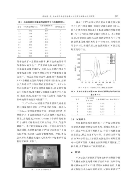 运行经验表明,如在 RTV 涂覆施工过程中引入杂 表 3 太赫兹透射法测量 RTV 标准试样厚度与千分尺测