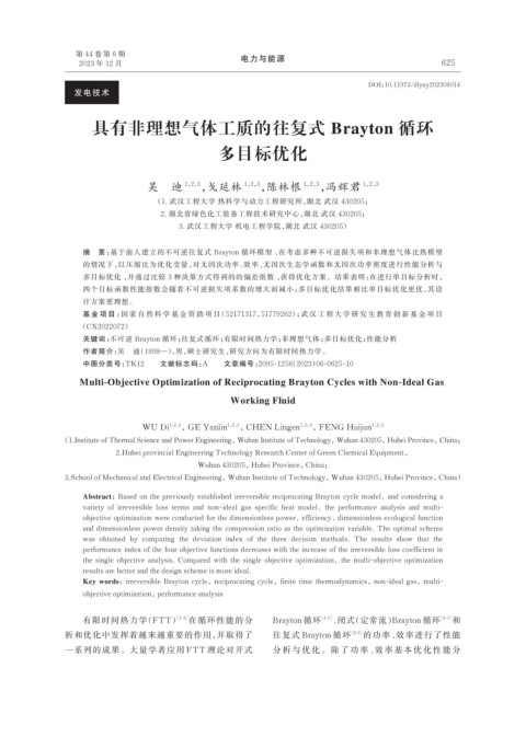 关键词:不可逆 Brayton 循环;往复式循环;有限时间热力学;非理想气体;多目标优化;性能分析
