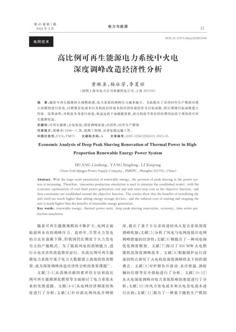 关键词:可再生能源;火电机组;深度调峰改造;经济性;时序生产模拟