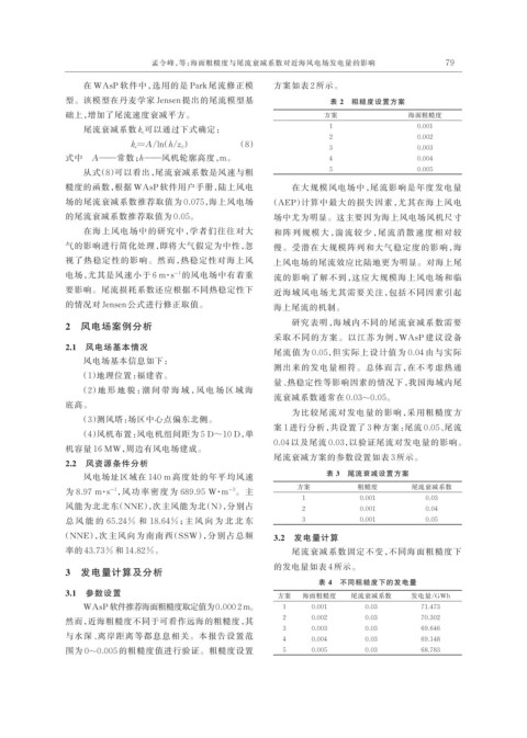 孟令峰,等:海面粗糙度与尾流衰减系数对近海风电场发电量的影响 79