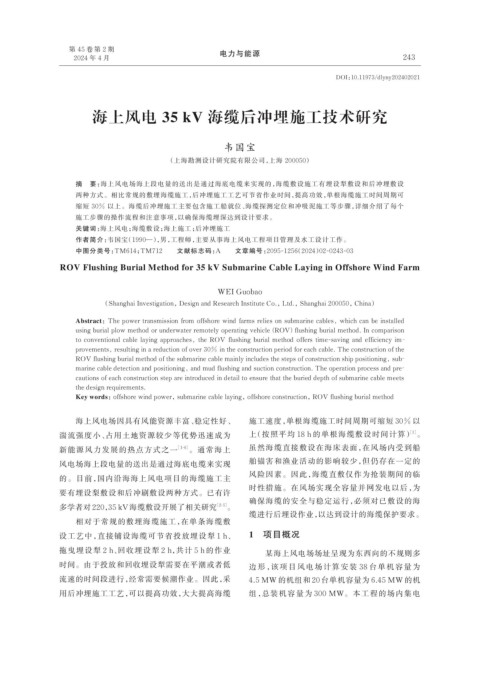 Key words:offshore wind power,submarine cable laying,offshore construction,ROV flushing burial method