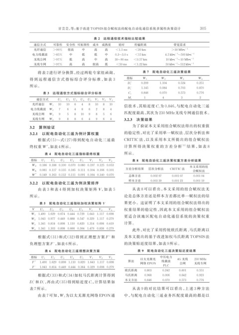 甘芸芸,等:基于改进 TOPSIS 组合赋权法的配电自动化通信系统多属性决策设计 305