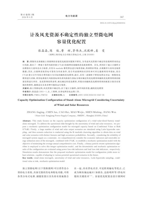 Key words:stand-alone microgrid,uncertainty of wind and solar resources,Latin hypercube sampling,condi⁃