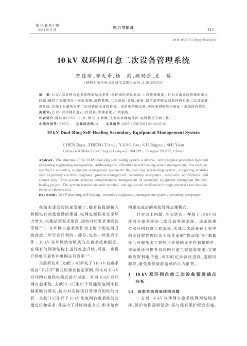 Key words:10 kV dual-ring self-healing,secondary equipment,management system,secondary acceptance