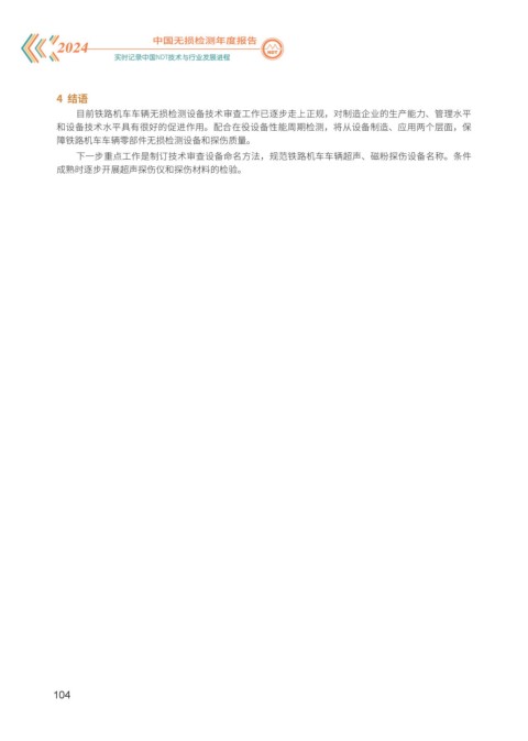4 结语 目前铁路机车车辆无损检测设备技术审查工作已逐步走上正规,对制造企业的生产能力、管理水平 和设备技术水平具有很好的促进作用。配合在役设备性能周期检测,将从设备制造、应用两个层面,保 障铁路机车车辆零部件无损检测设备和探伤质量。 下一步重点工作是制订技术审查设备命名方法,规范铁路机车车辆超声、磁粉探伤设备名称。条件 成熟时逐步开展超声探伤仪和探伤材料的检验。 104