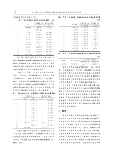拓扑变化的扰动前网络计算的各发电机功率突变 由表 6 和表 7 结果表明, 节点 11 和 12 间发