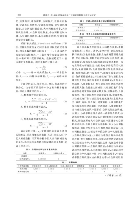 代、 建筑类型、 建筑面积、 空调制式、 空调机组数 表 9 空调大机组功率与削减量相关性