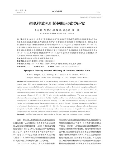 Ke ywords : coal-firedunit , mercur y concentrationinflueg as , ultra-lowemission , mercur yemission