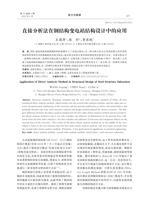 关键词: 直接分析法; 二阶分析法; 初始缺陷; 钢结构变电站