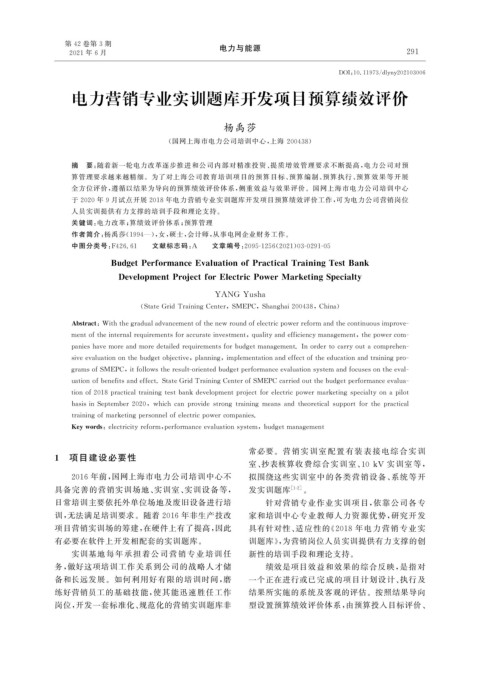 于 2020 年 9 月试点开展 2018 年电力营销专业实训题库开发项目预算绩效评价工作, 可为电力公司营销岗位