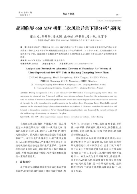 原因进行了分析。通过查 阅 历 史 数 据 并 听 取 西 安 热 工 院 的 分 析 意 见 后, 提 出 了 解 决 二 次 风 量 突 降 问 题 的