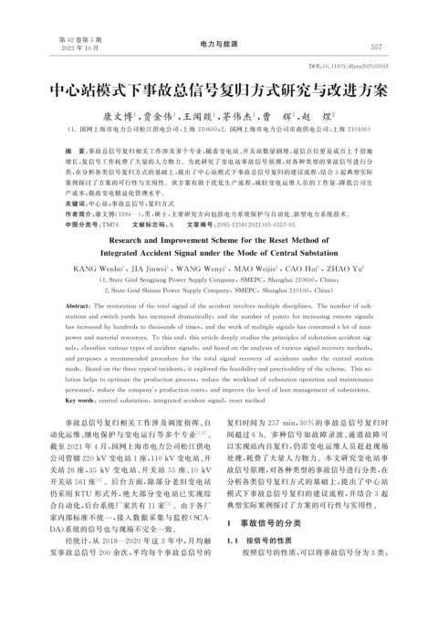 类, 在分析各类信号复归方式的基础上, 提出了中心站模式下事故总信号复归的建议流程, 结合3 起典型实际