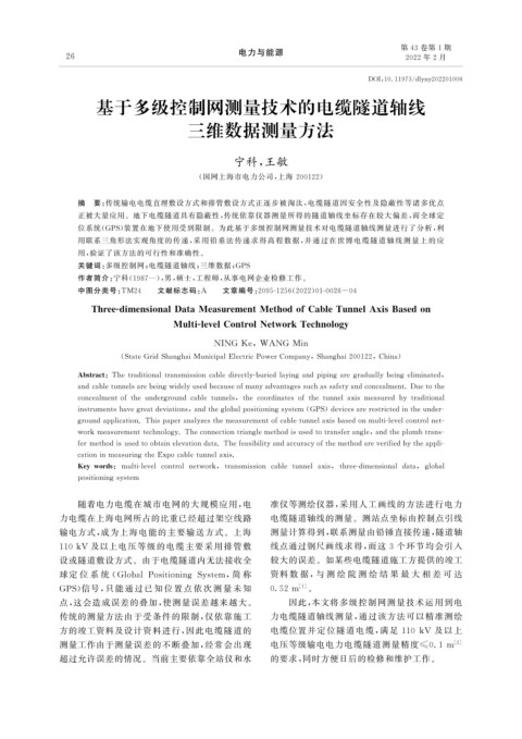 关键词: 多级控制网; 电缆隧道轴线; 三维数据; GPS