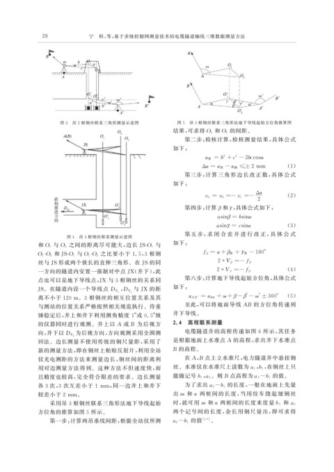 图 3 吊 2 根钢丝联系三角形测量示意图 图 5 吊 3 根钢丝联系三角形法地下导线起始方位角推算图
