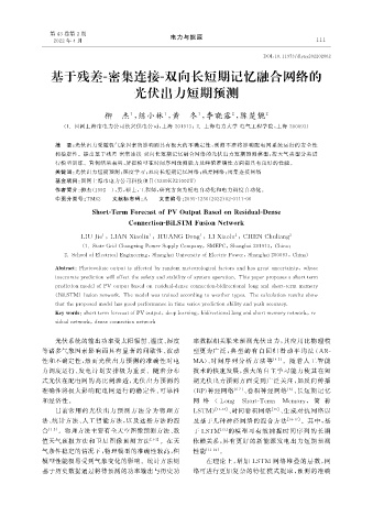 和稳定性。提出基于残差 - 密集连接 - 双向长短期记忆融合网络的光伏出力短期预测模型, 按天气类型分类进