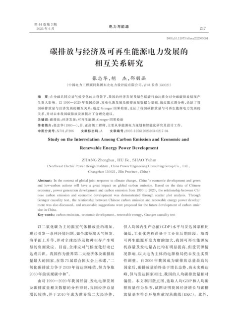 国碳排放量与经济发展的相互关系;通过 Granger 因果检验,论证了我国碳排放量与可再生能源电力发展的