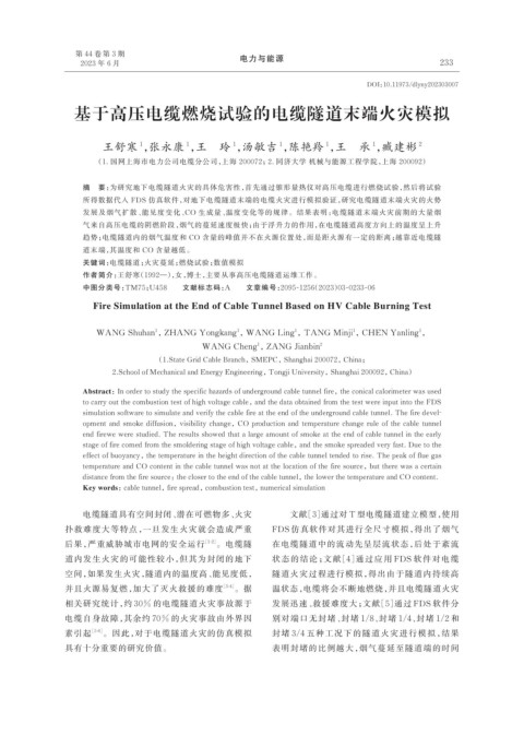 关键词:电缆隧道;火灾蔓延;燃烧试验;数值模拟