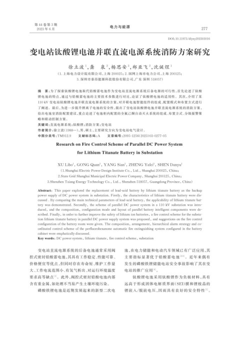 了阐述。最后,为进一步提升锂离子电池的安全性,提出了变电站钛酸锂电池并联直流电源系统的消防方案,