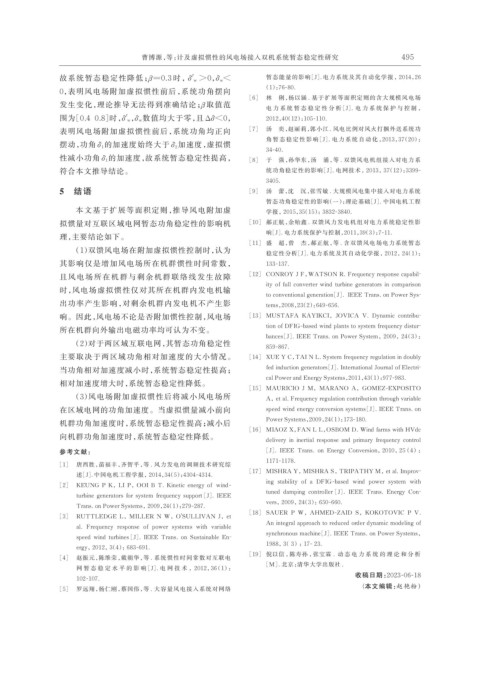 曹博源,等:计及虚拟惯性的风电场接入双机系统暂态稳定性研究 495