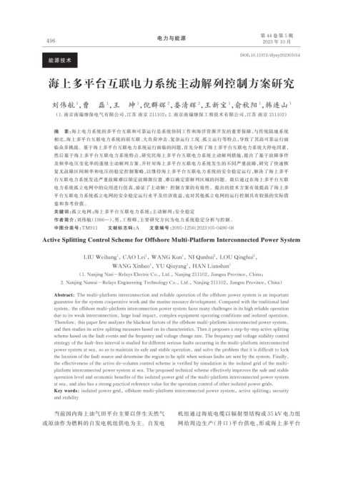 关键词:孤立电网;海上多平台互联电力系统;主动解列;安全稳定
