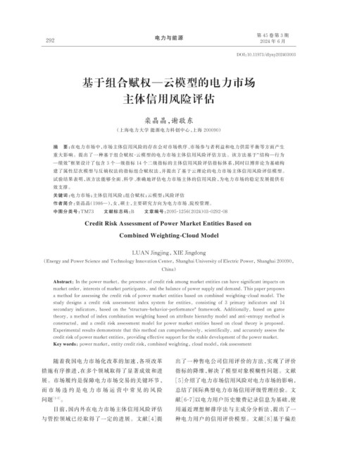 关键词:电力市场;主体信用风险;组合赋权;云模型;风险评估