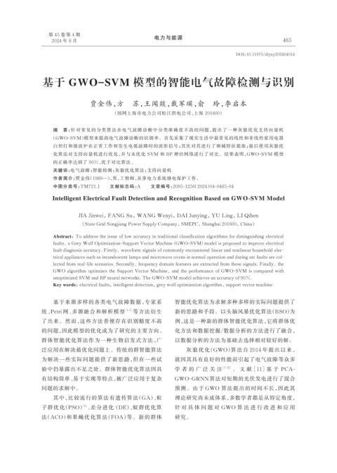 Key words:electrical faults,intelligent detection,grey wolf optimization algorithm,support vector machine