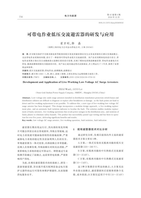 Key words:low-voltage AC surge arrester,live-working operation,fault isolation,fault indication