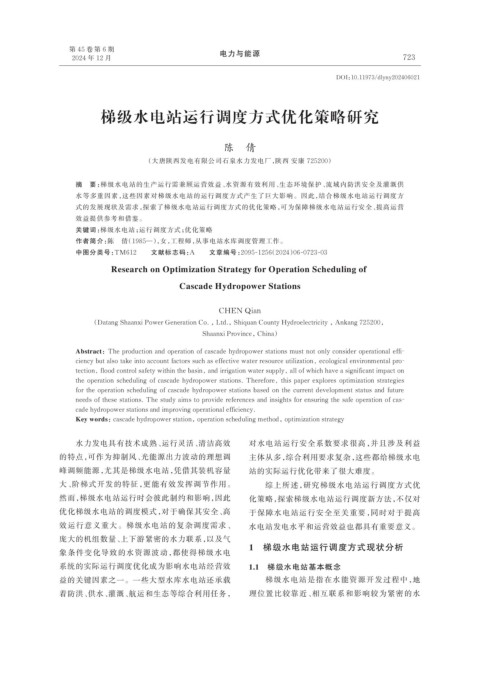 Key words:cascade hydropower station,operation scheduling method,optimization strategy