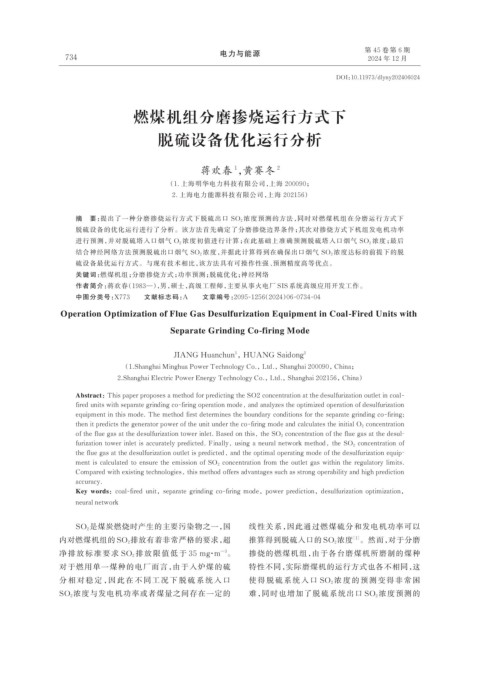 Key words:coal-fired unit,separate grinding co-firing mode,power prediction,desulfurization optimization,